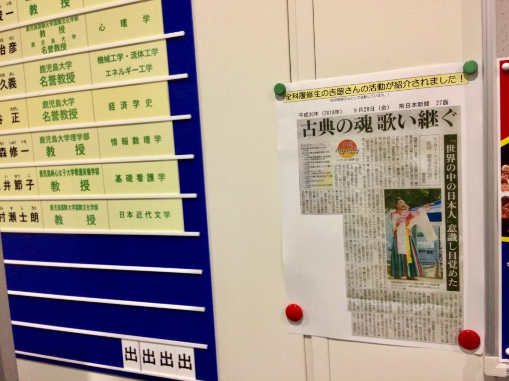 母校の鹿児島国際大学、音楽科のある8号館にポスターとCDの紹介記事を掲載していただいています! 各階の掲示板に貼ってあります。 ありがとうございます! -